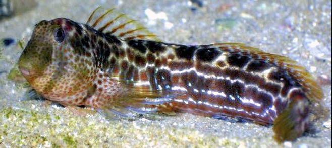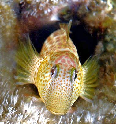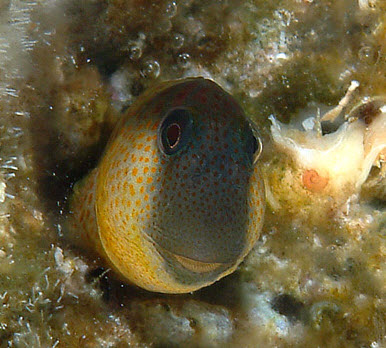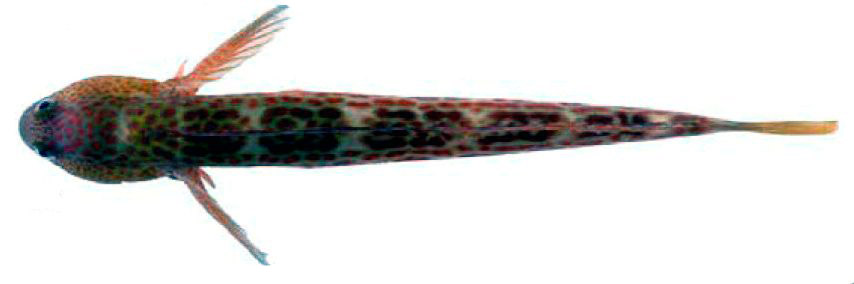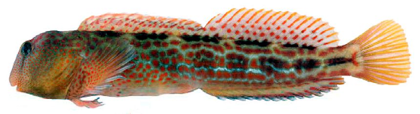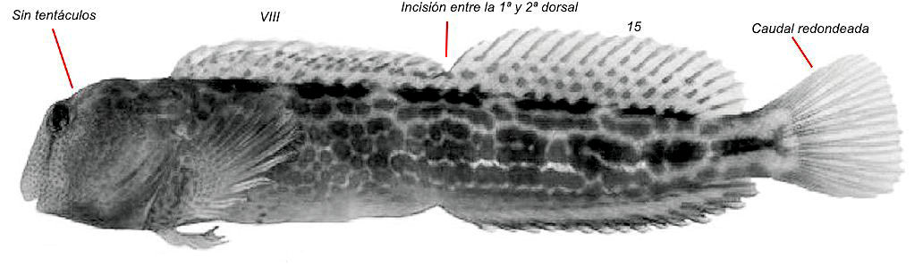 | cuerpo alargado y comprimido lateralmente y sin escamas. La cabeza no presenta tentáculos supraorbitales Incisión profunda entre la primera y la segunda aleta dorsal. La aleta dorsal es larga y posee 8 espinas y 15 radios blandos. La aleta anal 2 espinas y 16 radios blandos Color variable, pardo oscuro a amarillento con puntos más oscuros. A los machos, durante el periodos de reproducción, la cabeza se vuelve negra con las mejillas amarillo-naranjas. En la cabeza pequeños puntos rojos que se concentran en un solo punto en la parte superior |