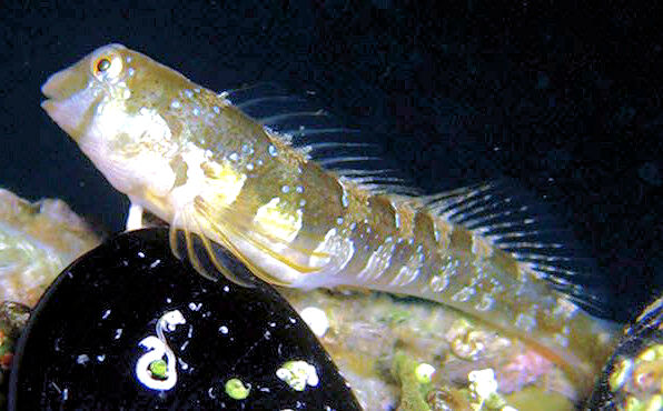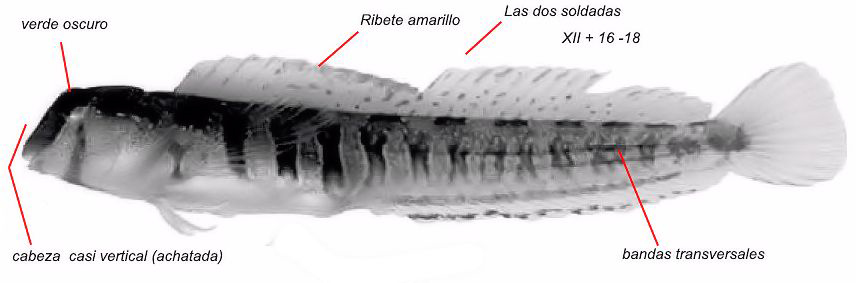 | Cuerpo alargado, comprimido lateralmente , sin escamas y línea lateral apenas visible. La cabeza tiene un perfil frontal casi vertical. Ojo relativamente grande Sin tentáculos supraorbitarios . La boca, ubicada en la posición inferior, tiene labios finos y dientes subcónicos . La aleta dorsal tiene la parte anterior formada por radios no articulados ligeramente más bajos que la segunda; el primer radio está plegado. La anal es menos alta que el dorsal. La caudal tiene un margen posterior redondeado. Los pectorales no son muy anchas y no alcanzan la abertura anal. Las pélvicas estan insertadas en posición yugular, son más cortas que la cabeza. Las aletas pectoral y pélvica ventral son de color verde amarillento intenso ; la mitad superior del tronco es verde oliva o marrón grisáceo; la nuca, la frente y el hocico son de color marrón oscuro. Una línea oscura y ondulada comienza en las comisuras de la boca y atraviesa la garganta . En la parte superior del tronco hay 8-11 bandas verticales parduscas . Otras 8-11 bandas de color oscuro , bordeadas de plateado, se encuentran en la parte inferior del tronco y suelen tender unirse con las bandas superiores. La parte anterior de la dorsal está bordeada de blanco y por debajo hay una franja oscura más o menos ancha y más o menos marcada. La anal tiene un margen blanquecino inferior, bordeada arriba por una raya gris - violetade. Una mancha marrón , a veces , es la base de la cola |