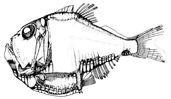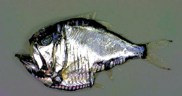| Cuerpo comprimido lateralmente Ojo tubular , dirigido dorsalmente Boca vertical; dientes caniniformes agrandados en la mandíbula . Aleta dorsal con 9 radios seguida de una aleta adiposa dorsal ; aletas pectorales 10-11 (12)radios, aletas pélvicas 6 radios, aletas anales 7 + 5 radios Espina preopercular inferior hacia abajo y curvada hacia adelante. Espina preopercular superior corta, dirigida hacia afuera . Espinas postabdominales iguales en tamaño y longitud Fotóforos ( adulto ): ORB 1, pigmentado, dirigido hacia el cristalino; BR (6); OP 3, OP3 primero en desarrollarse; PI (6); PV (12); VAV (4); ACI (6); AC2 (4); OA (2) + 6; Los grupos VAV, AC1 y AC2 están bien separados, los fotóforos de cada uno comparten un fotogénico común. masa; VAV, AC1 y AC2 elevados en relación con 6 OA posterior Color: dorso oscuro, flancos plateados; radios dorsales y pectorales pigmentados |