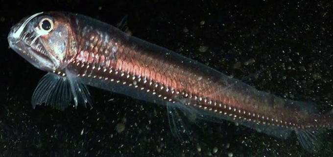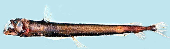 | Cuerpo largo, aplanado a los lados, profundidad máxima del cuerpo en la parte posterior de la cabeza. Cabeza corta, el hocico es tan corto que la boca muy ancha se abre hacia la parte posterior del ojo. La mandíbula inferior es más larga que la superior, la superior está armado con cuatro colmillos a cada lado. Aleta dorsal con el primer radio prolongado; con aleta adiposa cerca de la cola; aleta anal cerca de la cola. Dos filas ventrolaterales de fotóforos en cuerpo, entre las bases de las aletas pectoral y pélvica 21, entre la aleta pélvica base y origen de la aleta anal 26, posterior al origen de la aleta anal 11. Dorsal con 5-8 radios y su origen entre el séptimo y el octavo fotóforos de la serie lateral, aletas anales 11, aletas pectorales 13, aletas ventrales 7. Color: azul plateado iridiscente |