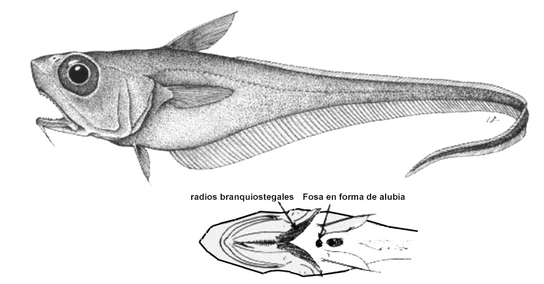 | Cabeza grande; blanda; alrededor del 20% de la longitud del cuerpo y uniformemente escamada, incluyendo las mandíbulas y las caras ventrales del hocico y suborbitario. Hocico romo, su punta con un tubérculo cónico. La boca es grande y subterminal, con una barbilla larga El tronco es corto, el cuerpo se estrecha abruptamente desde detrás de la primera aleta dorsal hasta formar una cola puntiaguda. La aleta caudal está ausente. Primera aleta dorsal, con 2 espinas y 12 radios blandos, es alta y truncada, y una segunda aleta dorsal y anal pequeña y continua .Aleta pectoral 1 espina y 13-18 radios ; aleta pélvica, 9-10 radios Color marrón grisáceo con la boca blanca. |