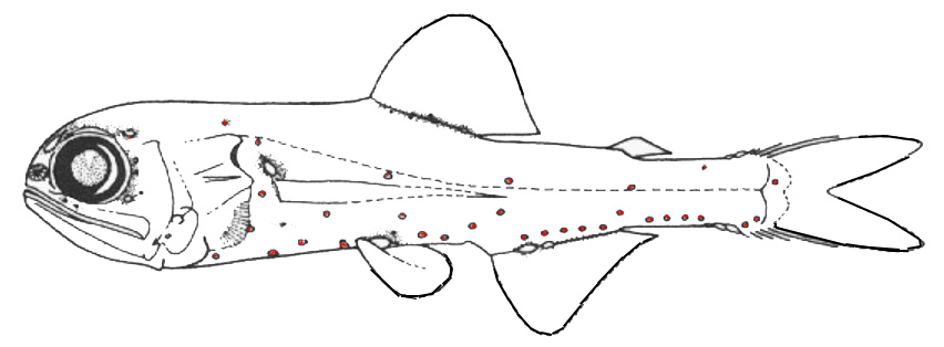 | aleta dorsal con 13 (12-14) radios; aleta anal 13 (12-14); aletas pectorales 13 (12-14). Branquiespinas 4 (rara vez 3 o 5) + 1 + 1 1 (10 12), total 16 (15-17, rara vez 18). AO 6 (5-7) + 4 (3), total 10 (9-11). Hembras sexualmente maduras con un par de parches luminosos en forma de salchicha y un par de parches luminosos circulares supraorbitalmente |