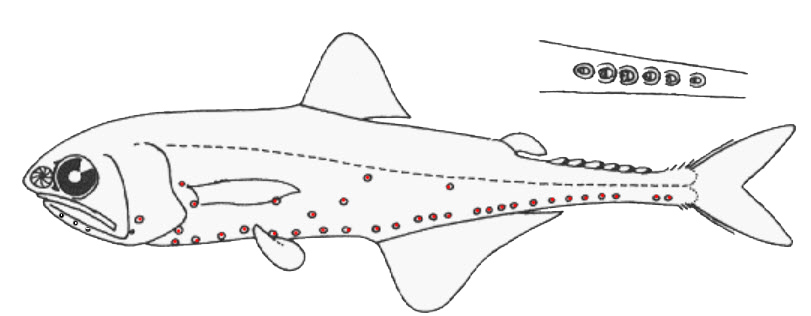| Hocico protuberante y carnoso, sin línea lateral Branquiespinas marcadamente reducidas Radios aleta dorsal 11 (10);radios aleta anal18 (17-19); radios aletas pectorales 15 (14). Fotóforos: AO 6 (4-6) + 10 (8-11), total 16 (14-17). Los machos con 5-6 (raramente 4 o 7) órganos luminosos separados con borde negro supracaudalmente ; hembra con 4-5 (raramente 3 o 6) órganos ovalados separados infracaudales. |