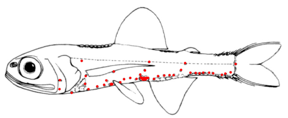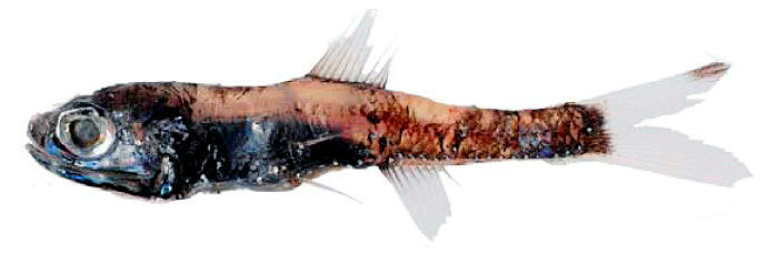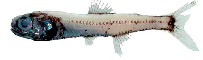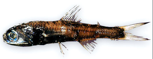 Se distingue externamente por la presencia cle una espina supraorbital y por tener pigmentarlos los extremos posteriores de los radios de la caudal. |