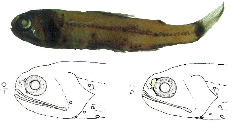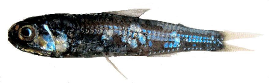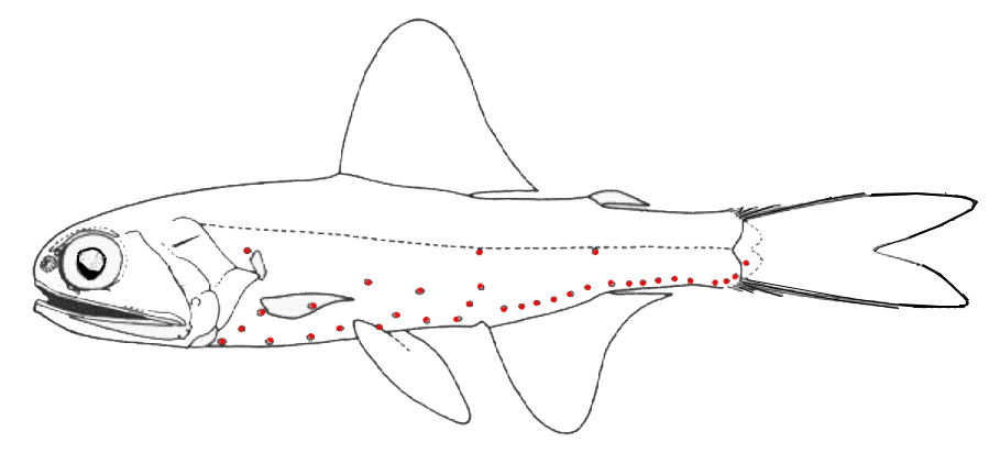| Cuerpo alargado y ligeramente comprimido Radios aleta dorsal 14 (15); radios aleta anal 15 (16); radios aletas pectorales 12 (10-13). Branquiespinas 6 (rara vez 5 o 7) + 1 + 14 (13-15), total 21 (20-22, rara vez 23). Fotóforos: OE 7 (6-8) + 5 (4-6), total 12 (11-13). 6-8 cm Fotóforos:Los fotóforos suborbitales (So) estaban ausentes, mientras que los fotóforos dorsonasales (Dn) eran pequeños e incrustados superficialmente. Los pequeños fotóforos ventronasales (Vn) ubicados en el margen ventral anterior de la órbita (uno para cada lado del cuerpo como para el Dn), un poco antes de el margen anterior de la pupila. Escama luminosa cerca del fotóforo suprapectoral (PLO); Siete fotóforos anales anteriores (AOa), alineados al mismo nivel. PVO = 2, PO = 5, VO = 5, SAO = 3, AOa = 7, AOp = 5 y Prc = 4. VO5, SAO1 y SAO2 estaban igualmente espaciados, formando una línea recta ascendente. Parche de tejido amarillo luminoso entre el margen de la órbita anterior, Dn y el órgano olfatorio; esta característica se considera una marca de secundaria sexual dimorfismo en machos PVO: 2 (primero en la base de la aleta pectoral; dos PVO en línea recta con el primer PO). PO: 5 (primero bien separado del resto; cuarto casi directamente encima del tercero). VO: 5 (primero, cuarto y quinto en línea recta; segundo y tercero en línea ascendente desde el primero) SAO: 3 (los dos primeros en línea recta con el quinto VO; el tercero muy por encima del segundo en la línea lateral) AOa: 6-8 (casi una línea recta con el último ligeramente torcido dorsalmente) AOp: 4-7 (casi una línea recta, el primero detrás del último radio de la aleta anal). Prc: 4 (línea curva con el cuarto separado por un espacio más grande y situado cerca de la línea lateral) PLO: 1 (en lo alto del cuerpo cerca de la línea lateral, ligeramente anterior a la vertical desde el segundo PVO ) VLO : 1 (a medio camino entre la base de la aleta pélvica y la línea lateral) Pol: 1 (en la línea lateral; a medio camino entre el último AOa y el primer AOp) La escama luminosa adyacente a PLO es de 3 a 4 veces su tamaño. Fotóforos de la cabeza Dn: presentes en la parte antero-dorsal de la órbita detrás de la fosa nasal; hembras con Dn reducido. Machos con Dn agrandado que se vuelve más grande que los órganos nasales. Vn: presente en la parte anteroventral de la órbita; más pequeño que los fotóforos corporales y, a menudo, oscurecido por tejido oscuro. Op: 2 (primero más pequeño que el fotóforo corporal detrás de la mandíbula, segundo arriba del mismo tamaño que un fotóforo corporal) |