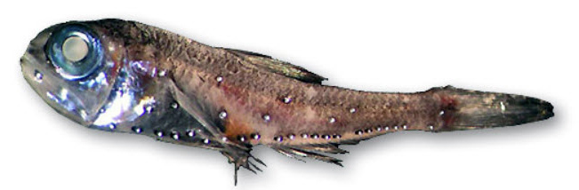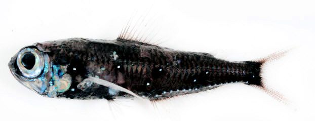 | La cabeza es casi cónica. El ojo es redondo y muy grande. La boca es ancha, cortada oblicuamente. La aleta dorsal se implanta en la mitad del cuerpo, tiene forma triangular, es menos larga que la anal y va seguida de una pequeña aleta diposa. Las pectorales son largas, puntiagudas y se extienden hasta el origen de la anal . Radios aleta dorsal 14 (13); radios aleta anal 21 (20-22); radios aletas pectorales 16 (15, rara vez 14 o 17). Fotóforos: AO 7 (6, rara vez 8) + 6 (5-7), total 13 (12-14). El color es marrón plateado, más oscuro en el dorso . |