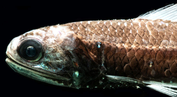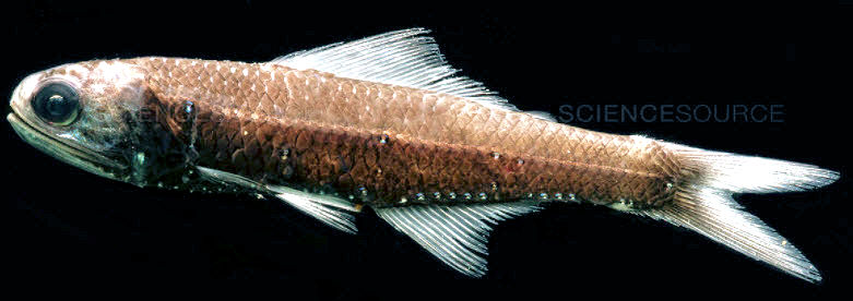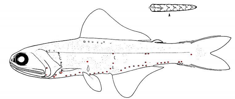 | Bajo número de branquiespinas (14-15). Elevado número de radios de la aleta dorsal (25-27) Dientes agrandados en la mitad posterior de la mandíbula inferior Origen de la aleta dorsal ligeramente por delante de la base de la aleta pélvica con 26-27 (25) radios. Origen de la aleta anal algo detrás de la vertical que pasa por la mitad de la base de la aleta dorsal, con20-21 radios. Aletas pectorales que se extienden hasta la base de las aletas pélvicas. Aletas pélvicas llegan al ano. Base de la aleta adiposa directamente sobre o ligeramente por delante del extremo de la base de la aleta anal. Fotóforos: AO 7 (6-8) + 4 (3-5), total 11 (10-12); órganos de la línea lateral 40-41; caudal con 9-10 + 10-11 radios OLP inmediatamente debajo de la línea lateral. VLO a mitad de camino entre la base de la aleta pélvica y la línea lateral o un poco más arriba. Dos, ocasionalmente 3 o 1, Pol inmediatamente debajo de la línea lateral. AOp detrás de la base de la aleta anal Machos adultos con una gran glándula supracaudal luminosa que consta de 6-8 segmentos que ocupan todo, o casi todo, el espacio dorsal del pedúnculo caudal. |