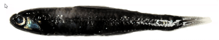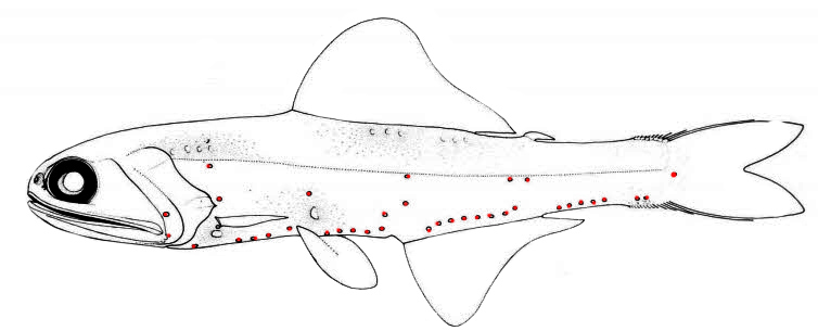 | Branquiespinas 6 (5-7) + 1 + 13-14 (12-15), total 20-21 (19-23) Sin dientes agrandados en la mitad posterior de la mandíbula inferior Origen de la aleta dorsal directamente sobre o ligeramente por delante de la base de la aleta pélvica con 21-23 radios. Origen de la aleta anal algo detrás de la vertical a través de la mitad de la base de la aleta dorsal con 19 (18-20) radios. Aletas pectorales no llegan a la base de las pélvicas con 2-13 radios Aletas pélvicas que se extienden hasta el ano. Aleta adiposa muy pequeña, su base algo antes de la vertical que pasa por el extremo de la base de la aleta anal. Fotóforos: AO 8 (7-9) + 5 (4-7), total 13 (12-14); órganos de la línea lateral 39-40; radios caudales procurrentes 9-11 + 10-12 Machos adultos con una gran glándula luminosa supracaudal que ocupa toda la cara dorsal del pedúnculo caudal |