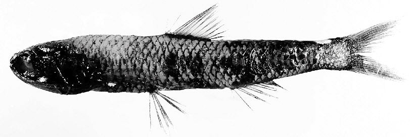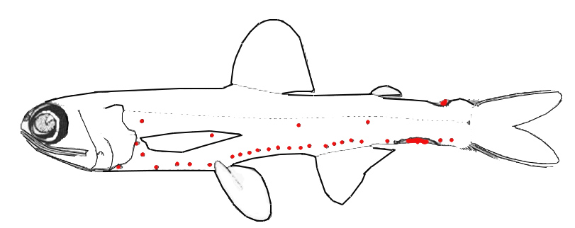 | Aleta pectoral bien extendida más allá de la base pélvica. Fotóforos: 5 PO, VO 8-10, solo 1SAO. Glándula luminosa supracaudal por lo general menos de la mitad de la longitud de glándula infracaudal. PVO1 muy por detrás de una vertical de PVO2. VLO a medio camino entre la base pélvica y la línea lateral. Espacio entre Prc1-2 igual a al menos dos fotóforos. PVO1 muy por detrás de una vertical de PVO2. VLO a mitad de camino entre la base de la aleta pélvica y la línea lateral, o un poco más cerca de esta última. Radios aleta dorsal 12, aleta anal 13, aletas pectorales 16-17, AO 7 + 4, PO 5, |