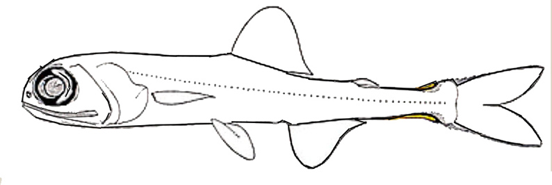 | Una gran media luna blanca en la mitad posterior del ojo Origen de la aleta dorsal detrás de la base de la aleta pélvica Sin fotóforos precaudales Radios aleta dorsal 12-13 (11); radios aleta anal 13 (11-14); radios aletas pectorales 14 (13-15). |