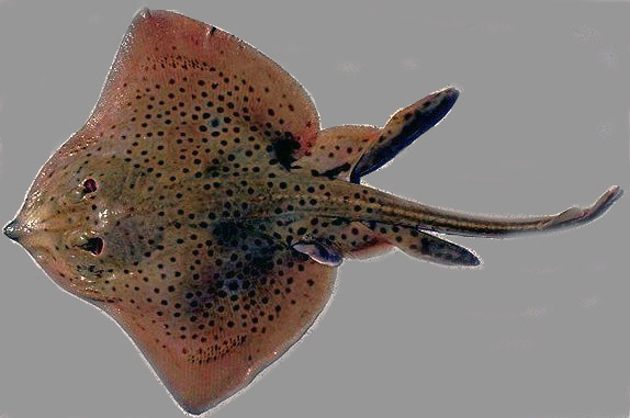 Color dorsal grisáceo a amarillento-marrón; disco y lóbulos posteriores de la aleta pelviana generalmente salpicadas de numerosas manchas negruzcas que no se extienden a los márgenes externos, manchas también en la cola; con frecuencia una concentración de manchas oscuras formando un anillo alrededor de un centro más pálido como un ojo-mancha en parte interna posterior de aletas pectorales; los puntos se pueden reducir en número o desvanecerse en algunos especímenes; blanco inferior, con márgenes del disco y lóbulos de las aletas pelvianas posteriores grisáceo