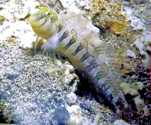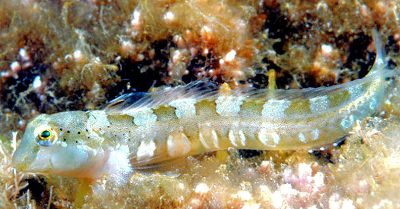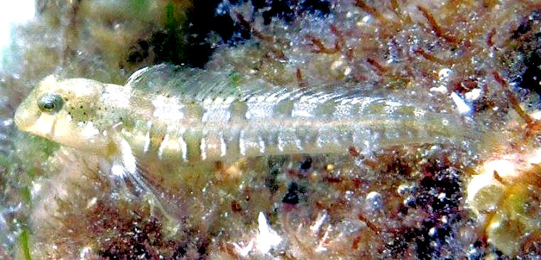 | Cuerpo alargado, comprimido lateralmente , sin escamas y línea lateral apenas visible. La cabeza tiene un perfil frontal casi vertical. Ojo relativamente grande Sin tentáculos supraorbitarios . La boca, ubicada en la posición inferior, tiene labios finos y dientes subcónicos . La aleta dorsal tiene la parte anterior formada por radios no articulados ligeramente más bajos que la segunda; el primer radio está plegado. La anal es menos alta que el dorsal. La caudal tiene un margen posterior redondeado. Los pectorales no son muy anchas y no alcanzan la abertura anal. Las pélvicas estan insertadas en posición yugular, son más cortas que la cabeza. Las aletas pectoral y pélvica ventral son de color verde amarillento intenso ; la mitad superior del tronco es verde oliva o marrón grisáceo; la nuca, la frente y el hocico son de color marrón oscuro. Una línea oscura y ondulada comienza en las comisuras de la boca y atraviesa la garganta . En la parte superior del tronco hay 8-11 bandas verticales parduscas . Otras 8-11 bandas de color oscuro , bordeadas de plateado, se encuentran en la parte inferior del tronco y suelen tender unirse con las bandas superiores. La parte anterior de la dorsal está bordeada de blanco y por debajo hay una franja oscura más o menos ancha y más o menos marcada. La anal tiene un margen blanquecino inferior, bordeada arriba por una raya gris - violetade. Una mancha marrón , a veces , es la base de la cola |