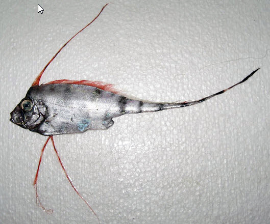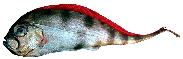 | Cuerpo alargado y muy comprimido lateralmente, con estrechamiento caudal Escamas cicloideas caducas y perfil ventral preanal lobulado Boca pequeña, protrusible, subvertical; fuertes dientes caniniformes en ambas mandíbulas, vómer y palatinos. Aletas pectorales son pequeñas y la aleta caudal es larga y nace en el extremo de la cola. Los radios de la aleta dorsal anterior y las aletas pélvicas son muy alargados en juveniles. Radios dorsales: 120-150. Sin aleta anal. Aleta caudal en dos partes distintas La línea lateral es espinosa y en su parte posterior presenta una serie de escudetes óseos que delimitan el margen inferior de la región postanal Jóvenes de color plateado con alrededor de 6 barras verticales en la parte dorsal del cuerpo y 4 en la parte ventral; cola con alrededor de 6 barras negras completas; aleta caudal negruzca, base de la aleta pálida. Adultos de color gris plateado, pero más pálidos ventralmente; aleta dorsal escarlata; aleta caudal negro rojizo, más oscura distalmente |