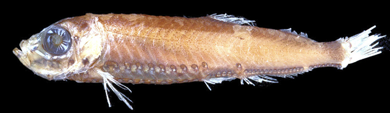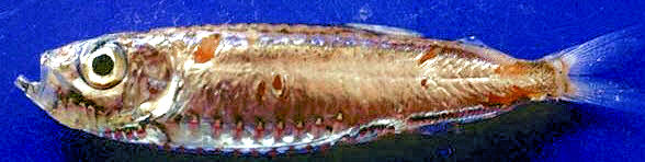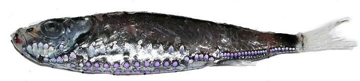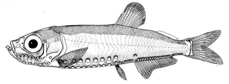 | Cuerpo fusiforme ; boca subvertical Aletas dorsales 11 (9-12) radios a la que sigue una aleta adiposa; aletas pectorales 17-19 radios; aletas pélvicas 7; radios finos anales 19 - 24; origen dorsal antes del origen de la aleta anal ; ano cerca del origen de la aleta anal ; aleta adiposa dorsal presente. Fotóforos ( adulto ): ORB l; OP 3, OP3 simple; BR (6); PI (6); VAV (6); AC en 3 grupos como 2 grupos largos precedidos por un único fotóforo elevado : I + (14-17) + (89) = 23-27; PV (12-13); OA (2) + 5. Color: cuerpo plateado con dorso oscuro con una franja ondulada dorsolateral marrón claro ; hocico y mandíbula transparentes con manchas de pigmento característico . |