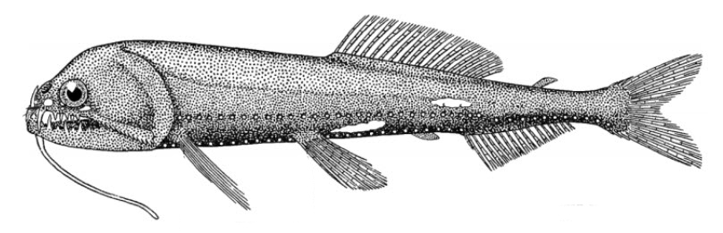 | Fotóforos seriados en fila lateral (OA) 29-32, de los cuales 17-21 detrás de la inserción de la aleta pélvica (VAL); 43-47 fotóforos en fila ventral a cola (IC); fila ventral que forma una curva pronunciada en forma de U entre las bases de las aletas pectorales. Barbillón de menos de 1,3 veces la longitud de la cabeza, delgado, sin punta modificada. Aletas dorsales 15-17. Color: cabeza y cuerpo negros; parches pálidos de tejido luminoso en muestras más grandes, el más prominente en la cabeza anterior al ojo , un par a cada lado (uno encima del otro) sobre la aleta pectoral , un parche largo ventral a las aletas pélvicas y uno arriba y anterior al origen de la aleta anal . |