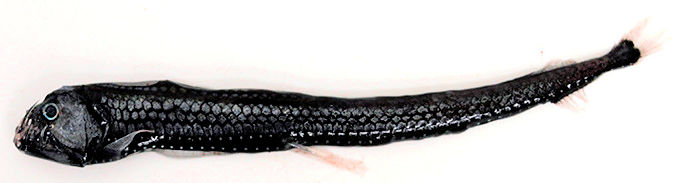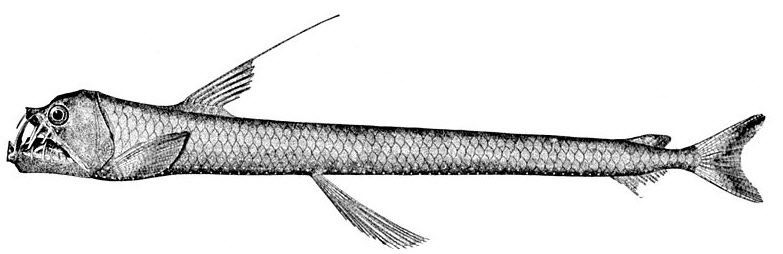 | Cuerpo largo, aplanado a los lados, profundidad máxima del cuerpo en la parte posterior de la cabeza. Cabeza corta, el hocico es tan corto que la boca muy ancha se abre hacia la parte posterior del ojo. La mandíbula inferior es más larga que la superior, la superior está armado con cuatro colmillos a cada lado. Aleta dorsal con el primer radio prolongado; con aleta adiposa cerca de la cola; aleta anal cerca de la cola. Dos filas ventrolaterales de fotóforos en cuerpo, entre las bases de las aletas pectoral y pélvica 21, entre la aleta pélvica base y origen de la aleta anal 26, posterior al origen de la aleta anal 11. Dorsal con 5-8 radios y su origen entre el séptimo y el octavo fotóforos de la serie lateral, aletas anales 11, aletas pectorales 13, aletas ventrales 7. Color: azul plateado iridiscente |