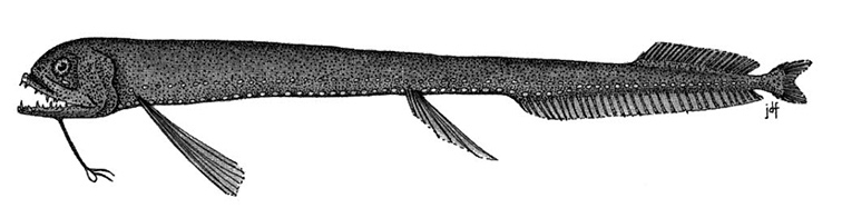| Cuerpo esbelto y alargado La mandíbula inferior es aproximadamente igual a la longitud de la mandíbula superior y no está hacia arriba en la punta. La premaxila tiene 8 dientes. La mandíbula inferior tiene 13 dientes Hocico largo, ahusado y protrusible Radios aleta dorsal: 22-30; radios de la aleta anal: 36 - 41 , aleta pectoral consta de 11 a 16 radios; aleta pélvica 8 Barbillón con tallo delgado y bulbo terminal ovoide, con 2 filamentos que varían en longitud desde muy corto hasta 3 veces la longitud del bulbo. El surco ventral profundo se extiende desde el istmo hasta detrás de la base de la aleta pectoral Foróforos: IP : 7; PV: 25 a 28 ;VAV:16 ; OV: 25 a 29; VAL:15 a 18 ; AC: 20 a 22. Faltan glándulas luminosas preorbitales y suborbitales. Po está presente El color es negro, con manchas blancas irregulares y redondeadas en la parte inferior del cuerpo en ejemplares grandes. El tallo de barbo está pigmentado de forma oscura. |