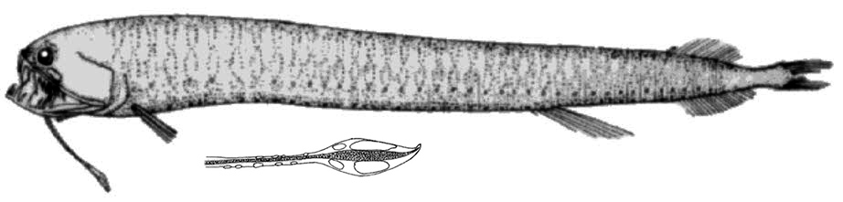 | Cuerpo alargado y moderadamente delgado, con un hocico corto, romo y no protrusible; Barbillón moderadamente corto que lleva una sección expandida terminal relativamente corta; y aletas pélvicas abdominales. La mandíbula inferior es aproximadamente tan larga como la superior y no tiene la punta hacia arriba. La premaxila tiene ocho dientes largos con púas. La mandíbula inferior tiene ocho o nueve dientes de púas largos. El barbillón tiene un tallo más delgado y una punta corta y ancha. La punta tiene ala a cada lado del eje y cada ala contiene uno o dos cuerpos esféricos a largos y opacos, con un lado del extremo distal de la punta que se estrecha para formar un filamento puntiagudo corto. La aleta pectoral está poco desarrollada y consta de 4 o 5 radios. Aleta dorsal con 12 a 16 radios. Aleta anal con 16 a 19 radios. La aleta pélvica tiene 7 radios. Fotóforos: IP: 10 u 11, PV : 27 , VAV : 12 a 15. OV: 23 a 26, VAL :11 a 15 y AC: 9 o 10. Los órganos luminosos preorbitales y suborbitales están ausentes. Po es aproximadamente igual al diámetro del ojo y tiene forma triangular. El color es negro. La barbilla es negra y la punta de la barbilla no está pigmentada |