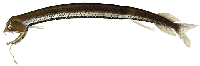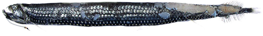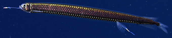 | Cabeza con una barbilla en el mentón tan larga como la cabeza que termina en tres filamentos cortos Cuerpo largo y delgado cubierto por seis filas de hexágonos que están formados por las escamas a lo largo de los lados de su cuerpo Con dos filas de fotóforos grandes (82-91) en posición ventral (IC, desde el extremo anterior del istmo hasta la parte carnosa de la cola) Mandíbula superior con un diente anterior pequeño , un colmillo grande y de 3 a 5 dientes más pequeños ; mandíbula inferior con 2 dientes anteriores pequeños , 2 dientes grandes y 3 a 7 dientes más pequeños Su aleta dorsal es muy corta con 17-22 radios y cercana a la aleta caudal. La aleta anal similar a la aleta dorsal en tamaño, forma y ubicación con 18 – 22 radios, mientras que la aleta caudal es corta y extremadamente redondeada. Las aletas pélvicas son largas y se colocan muy cerca del extremo posterior del pez, mientras que las aletas pectorales son muy reducidas. Cuerpo plateado iridiscente a los lados; negro a marrón oscuro. Tallo de la barbilla pálido, una mancha oscura en la base del bulbo |