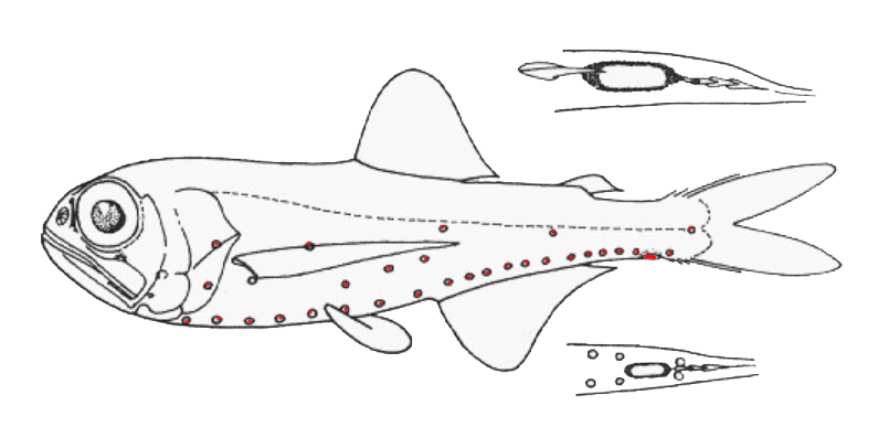 | Radios aleta dorsal 13 (12, raramente 14); radios aleta anal 17 (16-18); radios aletas pectorales 14 (13). Fotóforos: AO 6 (5-7) + 5 (6), total 11 (12) SAO angulado; VOl. SAO1 y SA02 casi en una línea (o con SAO, ligeramente por encima) Machos con una sola glándula supracaudal grande. Hembras con dos parches luminosos infracaudales, que se fusionan con la edad en una sola glándula |
