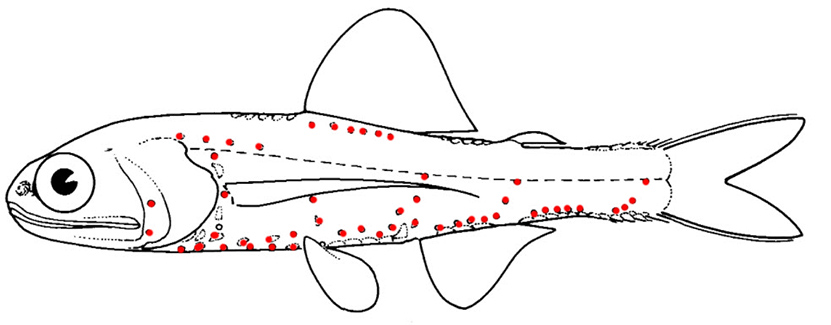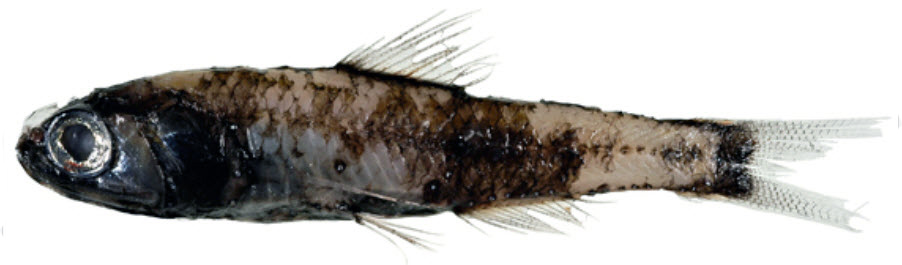 | El maxilar se extiende muy por detrás de la órbit P grande, que se extiende más allá del origen de A. Vn presente, POL más cercano al peaje. PVO1 en la base media de la aleta pectoral. 5 PO, PO 5 elevado, 5 VO, VO2, 3, 5 elevado. VO4, SAO1,2 y SAO3 forma una línea recta. Serie AO dividida en AOa y AOp, Pol justo debajo de LL. Parches de luminiscencia sobre pectorales, pélvicas, anales. D 13, A 13, P 15, GR 4 + 1 + 9, AO 6+ 4 |