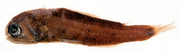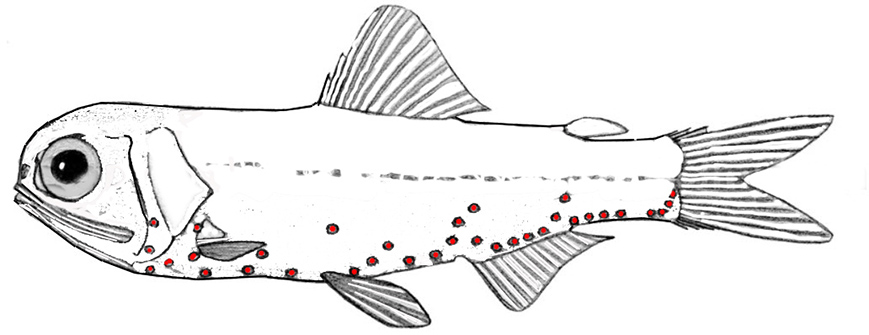 | Radios aleta dorsal: 14-15; radios aleta anal: 15; radios aleta pélvica: 8 radios aleta pectoral: 11 Branquiespinas: 18 Fotóforos PVO : 2 (primero en la base de la aleta pectoral; dos PVO en línea casi recta con el primer PO). PO: 5 (primero bien separado del reposo; 2-3-5 en línea recta; cuarto elevado por encima del nivel de los otros 4; ) VO: 5 (primero, segundo, cuarto y quinto en línea recta a lo largo del vientre; tercero elevado) SAO : 3 (primero sobre el ano; en línea empinada equidistantes entre sí; tercero muy por debajo de la línea lateral) AOa: 6 (primero elevado comparado con el segundo, segundo a quinto en línea, sexto elevado ligeramente) AOp: 4 (casi una línea recta, primero sobre el último radio de la aleta anal) Prc: 4 (línea curva con el cuarto separado más que los otros tres; cuarto distancia similar de LL como SAO3 y Pol) PLO: 1 (mucho más cerca de la aleta pectoral que de la línea lateral, directamente sobre la segunda PVO ) VLO : 1 (mucho más cerca de la base de la aleta pélvica que LL) Pol: 1 (a la misma distancia de LL que Prc4 y SAO3; ligeramente posterior a la última AOa). Una gran escama triangular luminosa adyacente a PLO es de 3 a 4 veces su tamaño. Dn: presentes en la parte anterodorsal de la órbita por encima de la fosa nasal; pequeño, redondo y dirigido anteriormente. Vn: presente en la parte anteroventral de la órbita; alargado pero relativamente pequeño; corre desde debajo de la fosa nasal hasta el nivel del margen anterior de la pupila. Op: 2 (la primera pequeña detrás de la mandíbula, la segunda arriba es similar en tamaño a un fotóforo corporal) Color Cuerpo negro con fotóforos más pálidos. Piel desnuda pálida. Un tejido oscuro rodea el Dn y la mayor parte del Vn. |