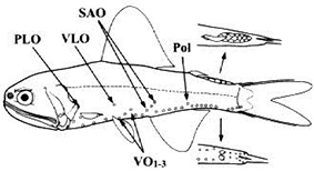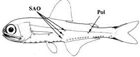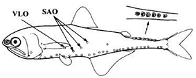 | Con tres fotóforos supraanales (SAO) AO en línea recta o ligeramente angular SAO1 detrás de VO3 |