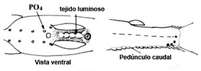 | Pedúnculo caudal con un órgano luminoso supracaudal en machos e infracaudal en hembras | ![]() |