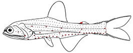 | Con pequeños y espaciados fotóforos debajo del perfil dorsal. Prc separado de AOp La glándula luminosa infracaudal se extiende a lo largo de todo el pedúnculo caudal Aleta anal con 17 (16-18) radios |