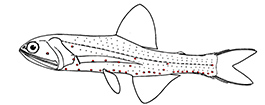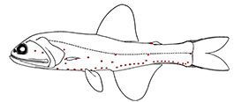 | Diminutos fotóforos repartidos por todo el cuerpo. Prc continua con AOp Glándula luminosa infracaudal que ocupa la mitad, o menos, de la longitud del pedúnculo caudal Primer arco branquial con 12 (raramente 13) branquispinas |