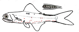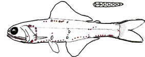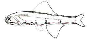 | Branquiespinas 19-23 Fotóforos anales AO 12-14; órganos de la línea lateral 39-40 |