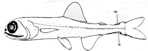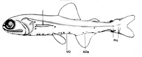 | Con 3-5 fotóforos ventrales(VO). Fotóforos anales (Aoa) anteriores 1-4 y posteriores 1-2. fotóforos posterolaterales (Pol) en la vertical del origen posterior de la base de la aleta adiposa. La distancia entre los fotóforos precaudales (Pc1 y Pc2) es igual o menor que el diámetro de cualquiera de ellos. El Pcr3 en la línea lateral |