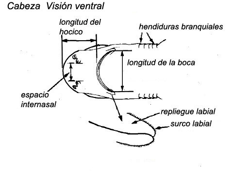 - Boca ventral; dos sacos olfativos que no se abren en la cavidad bucal en los elasmobranquios; fosas nasales abiertas en la cavidad de la boca en quimeras